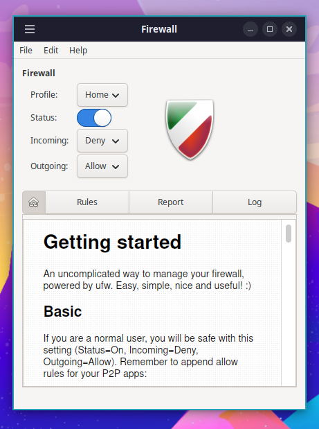 You can manage firewall rules from a terminal using sudo ufw. If you prefer a graphical interface, you can launch Firewall Configuration via Cinnamon menu or Apps menu.